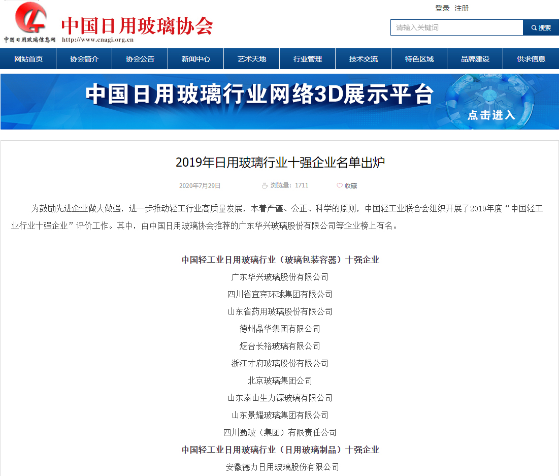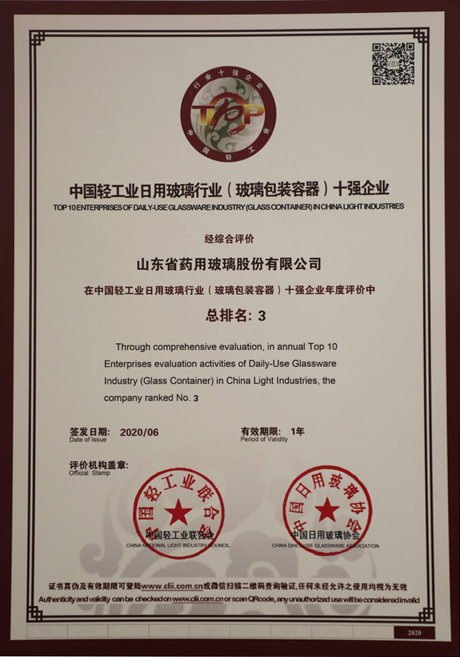 山東藥玻被評為2019年度中國輕工業(yè)日用玻璃行業(yè)(玻璃包裝容器)十強(qiáng)企業(yè) 第3名